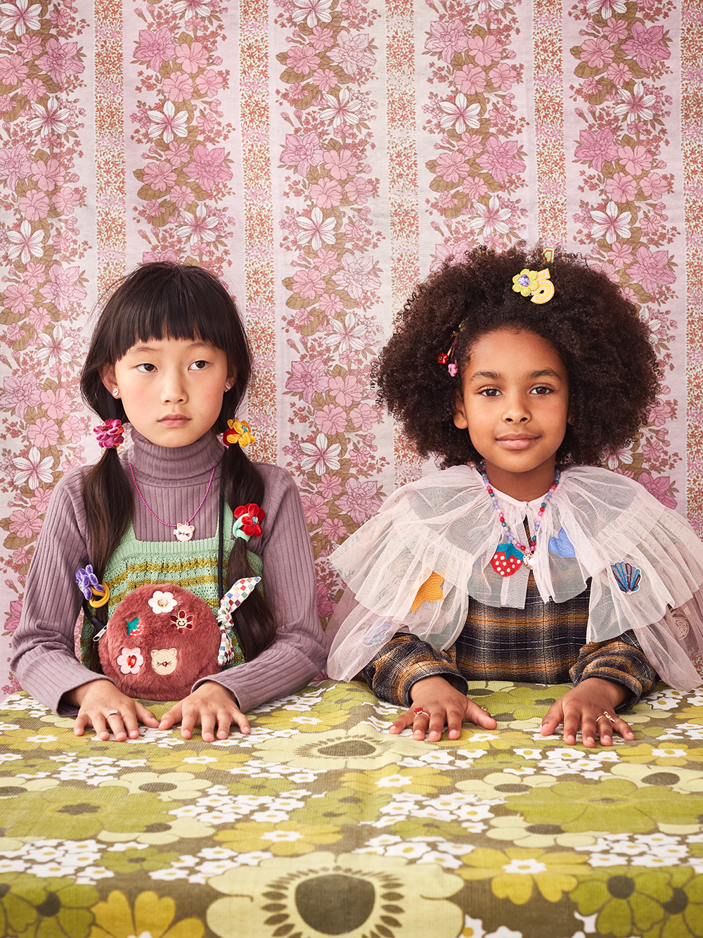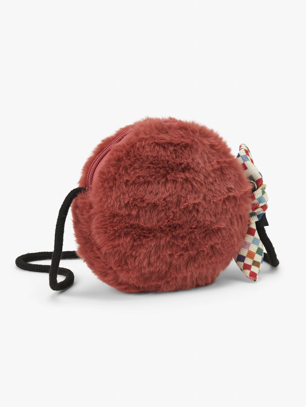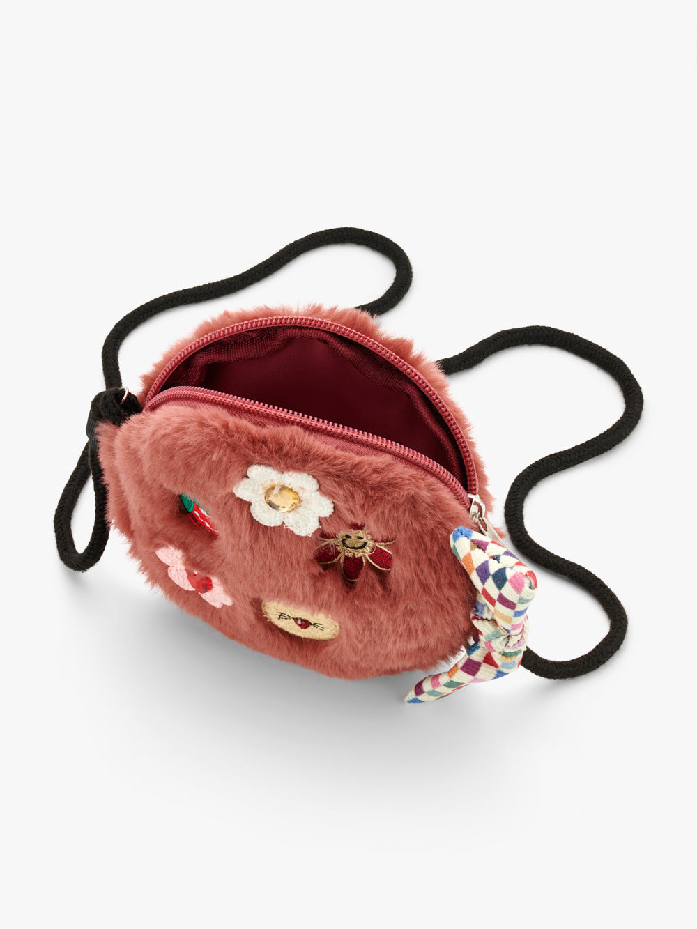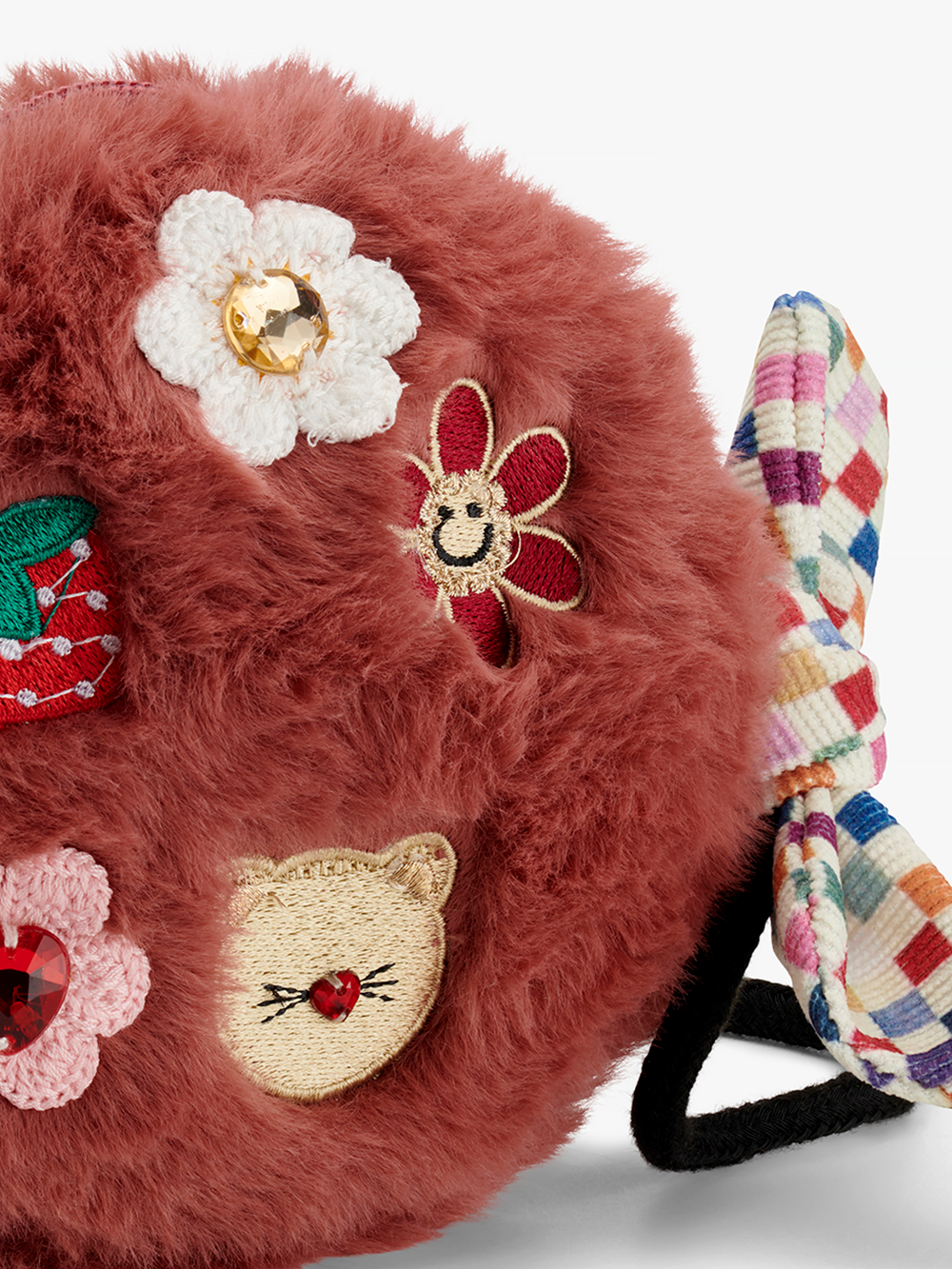 Faux fur round bag with gem, crochet flower and character patch detail. Long rope crossbody strap. Tie bow and zip closure.