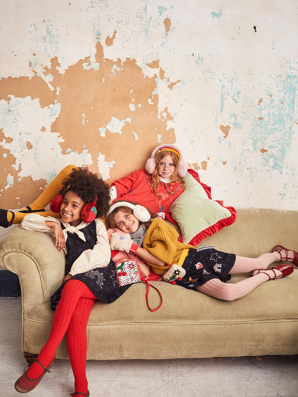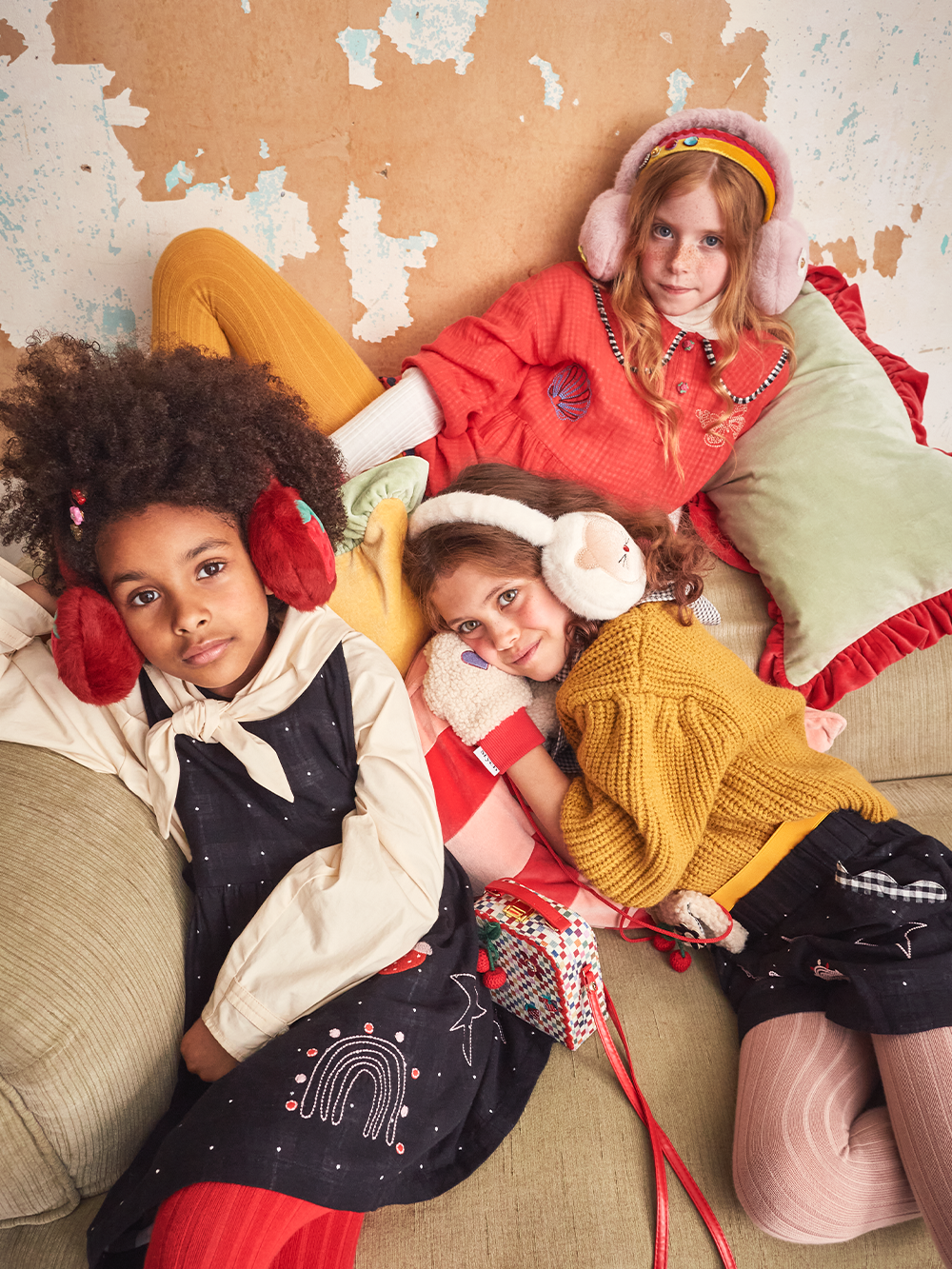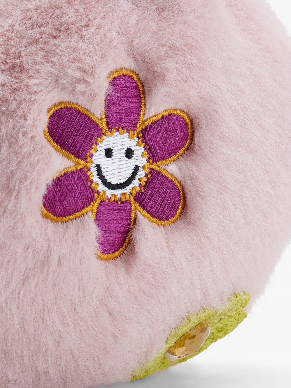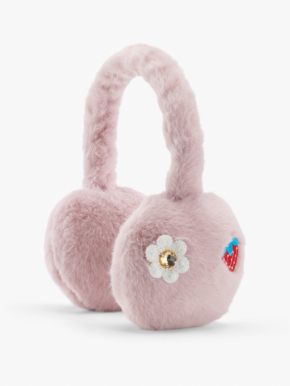 Pink faux fur earmuffs with patch embroidery and crochet gem flower detail. Adjustable height.