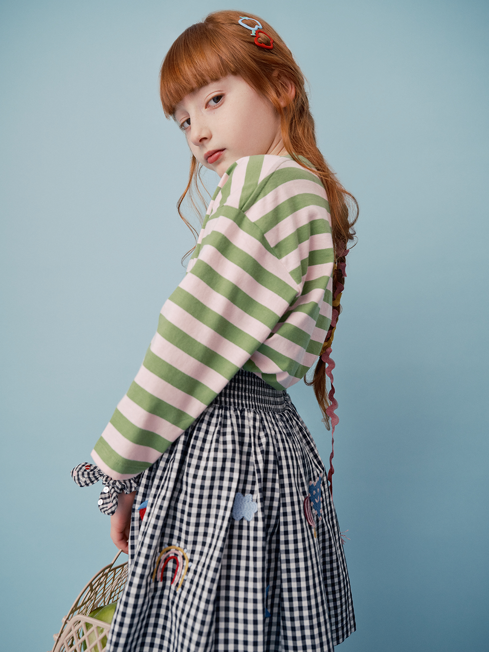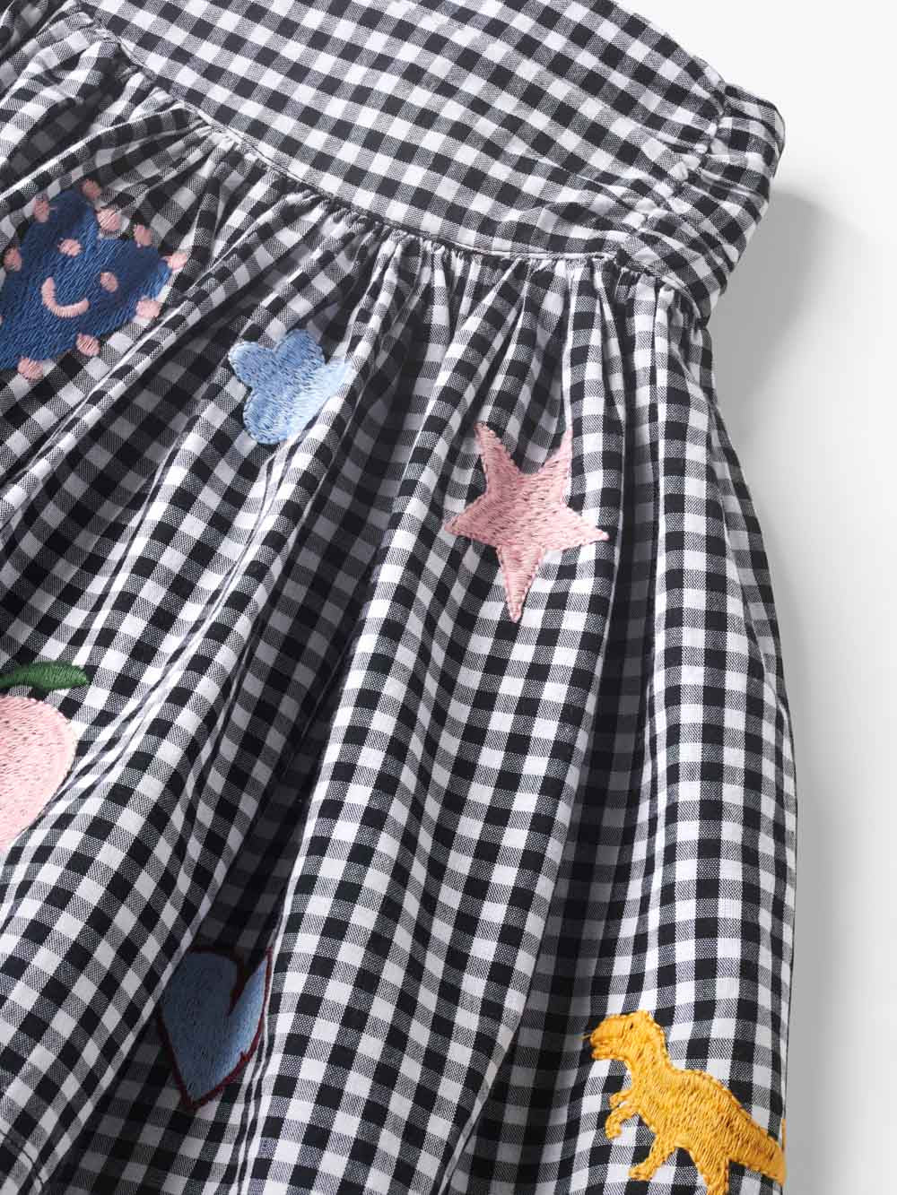 Gingham skirt with ruched yoke waistband front and elasticated back. Featuring Stych iconic character embroidered appliqué.